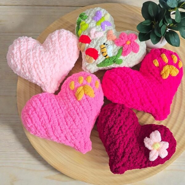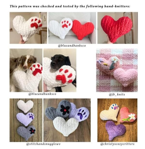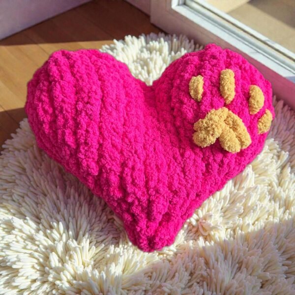 With this purchase, you will receive a PDF pattern with direct link and QR Code for the video tutorial of Handknit Heart Pillow Plushie with Paw Print & Flower Surface Chunky Knit Surface Embroidery