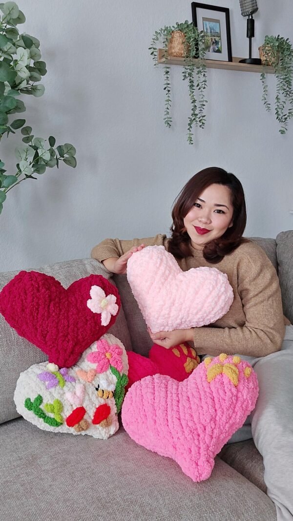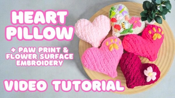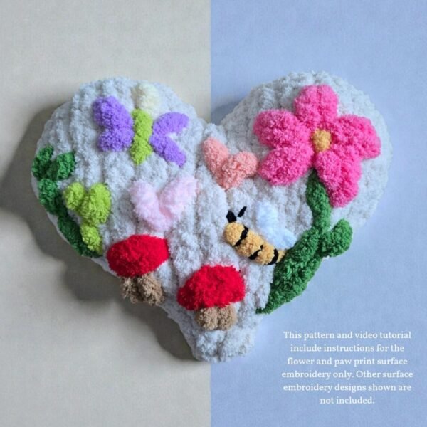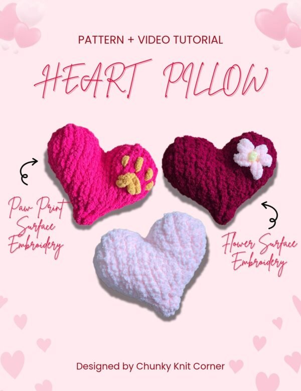 Updated Heart Pillow Pattern – This is an improved version of the original Heart Pillow pattern, featuring clearer instructions and new techniques for paw print and flower surface chunky knit embroidery. Designed to be beginner-friendly and fun to make.