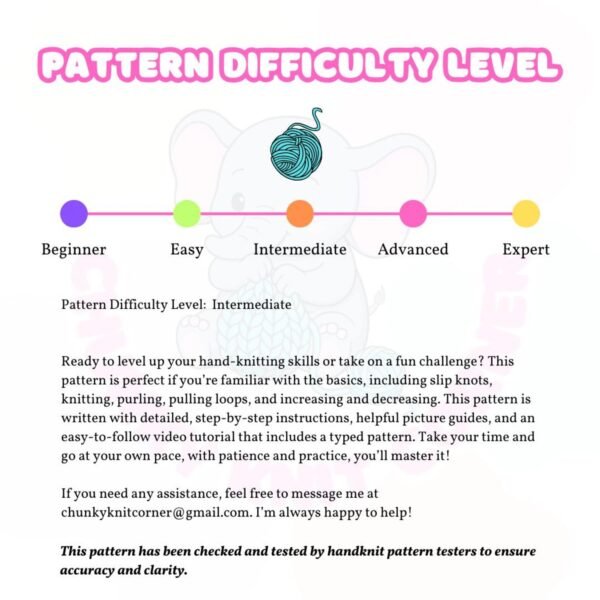 Ready to level up your hand-knitting skills or take on a fun challenge? This pattern is perfect if you’re familiar with the basics, including slip knots, knitting, purling, pulling loops, and increasing and decreasing. This pattern is written with detailed, step-by-step instructions, helpful picture guides, and an easy-to-follow video tutorial that includes a typed pattern. Take your time and go at your own pace, with patience and practice, you’ll master it!